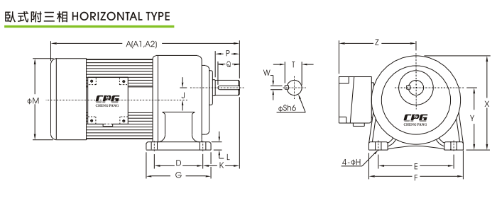 (一)下圖為標準型CH..S(B)臥式附三相鋁/鐵殼(剎車)齒輪減速馬達