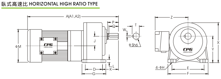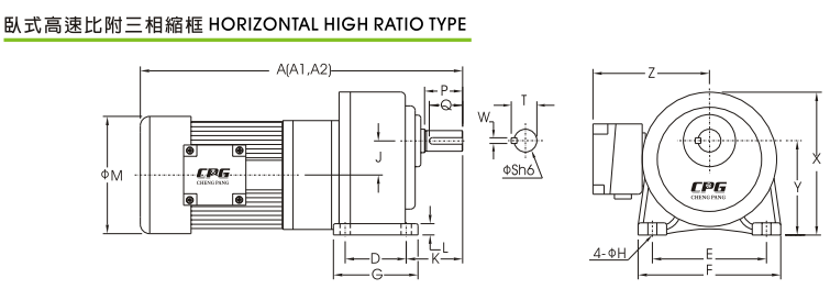 (一)下圖為標(biāo)準(zhǔn)型臺(tái)灣城邦CH..S(B)臥式高速比附三相(剎車)齒輪減速馬達(dá)詳細(xì)參數(shù)及選型參數(shù):